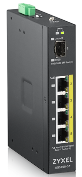 Промышленный PoE+ коммутатор Zyxel RGS100-5P, 4xGE PoE+, 1xSFP, крепление на стену/DIN-рейку, IP30, два источника питания DC, бюджет PoE 120 Вт
